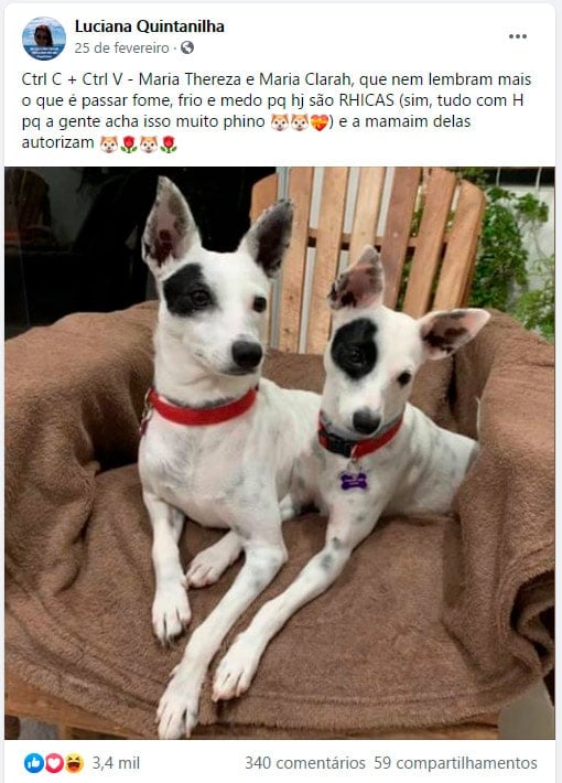 Em um post compartilhado no Facebook por sua dona, Luciana Quintanilha, de São Paulo, brinca com a semelhança das cadelinhas “Ctrl C + Ctrl V – Maria Thereza e Maria Clarah, que nem lembram mais o que é passar fome, frio e medo porque hoje são RHICAS (sim, tudo com H porque a gente acha isso muito phino) e a mamãe delas autorizam”, escreveu Luciana na legenda do post.