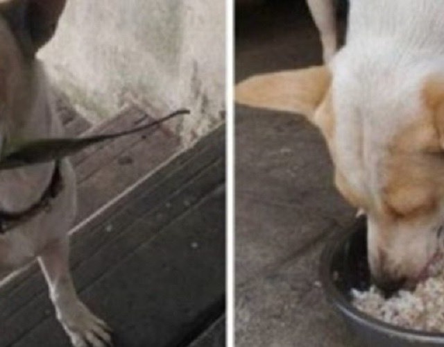 Todos os dias, o cão aparece com um objeto diferente na boca e, assim que a vê, deixa o objeto como forma de agradecer o alimento que ela fornece a ele todos os dias.