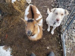 Seu cão, com mais um amigo canino, e um bode, isso mesmo, um bode, estavam juntos.