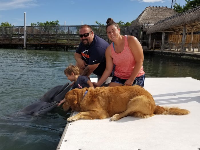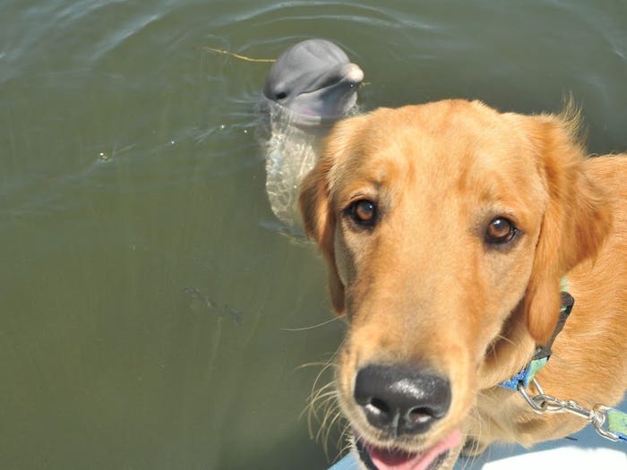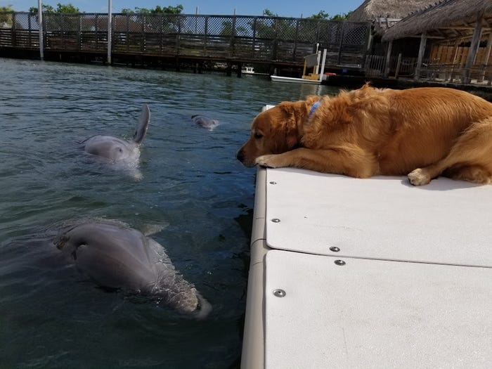 Gunner, 8, e Delta, 10, um golden retriever e um golfinho, se conheceram no Dolphin Research Center da Flórida há nove anos e têm sido os melhores amigos desde então. Marie Blanton, uma treinadora sênior do centro e mãe de Gunner, disse ao Insider que os treinadores trabalham para construir relacionamentos com golfinhos e para conhecê-los individualmente. Como tal, ela queria expô-los a tantas coisas diferentes quanto possível – incluindo seu então novo cachorrinho de 8 semanas que a acompanharia ao trabalho todos os dias.