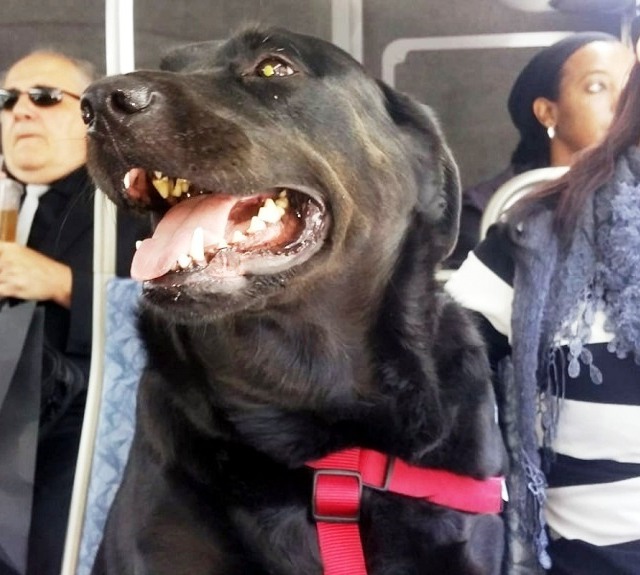 O cãozinho é muito fofo é uma mistura de Lab e Mastiff o cão pega o ônibus todos os dias sozinho para poder ir ao parque. O cão mostra que é muito independente.