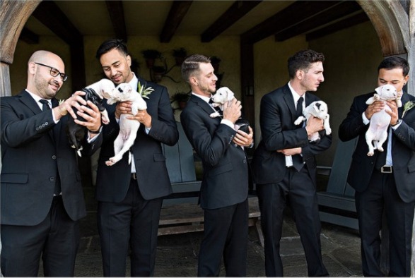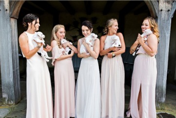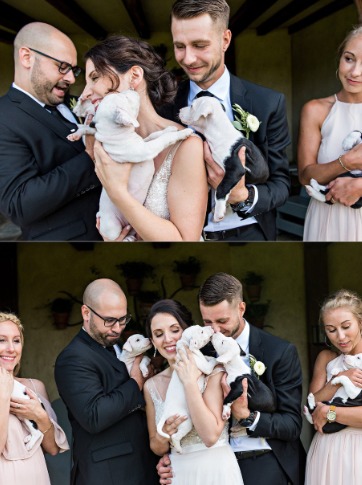 Nas fotos absolutamente adoráveis, cada uma das quatro damas de honra seguravam um cachorrinho. Além disso, os padrinhos também estavam uma graça segurando os filhotes, que davam “lambeijos“.