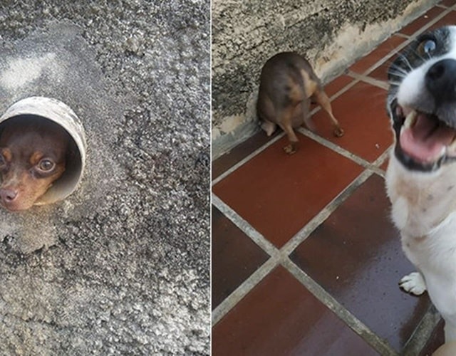 Você já viu um cachorro fofoqueiro? A pinscher Nina de Ibiporã (PR) descobriu um jeito diferente de acompanhar o movimento da rua. Ela coloca a cabeça dentro do cano do quintal para ver o que acontece do outro lado do muro.