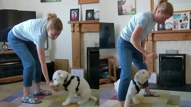 Ao todo, o cãozinho aprendeu nove comandos como: “senta”, “fica em pé”, “me olhe”, “gira”, “dá a pata”, “deita”, “vem”, “fica” e “seguro” – comando para que o cão passe por baixo das pernas da tutora e fique lá.