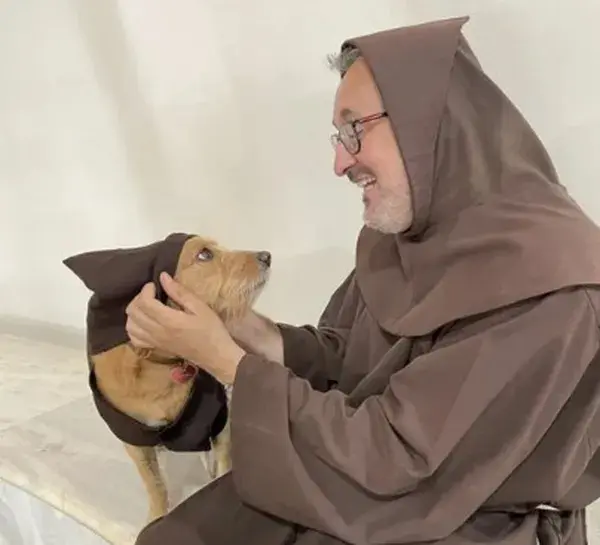 A Paróquia Nossa Senhora de Fátima, em Uberlândia, conta com um participante fiel e muito fofinho em todas as missas. O cachorro caramelo Pedrinho, adotado pelo Frei Joaquim Camilo Alves, acompanha o tutor no altar e até usa uma batina de padre franciscano.