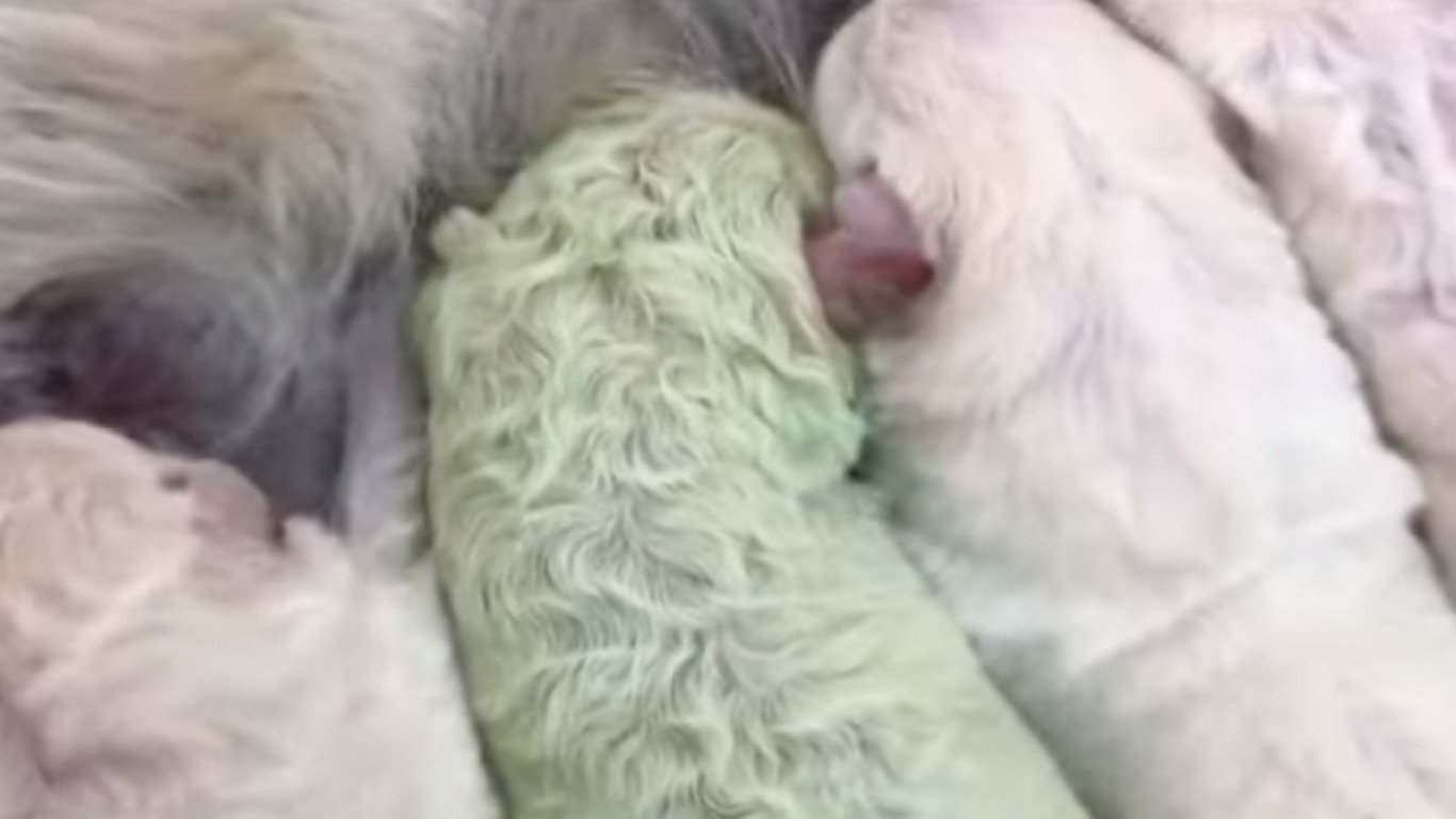 No dia 9 de outubro, uma cachorrinha na Itália deu à luz cinco filhotinhos e, para a surpresa de todos, um dos cachorros nasceu com o pelo verde. Em homenagem ao fenômeno raro, o filhote recebeu o nome de Pistachio.