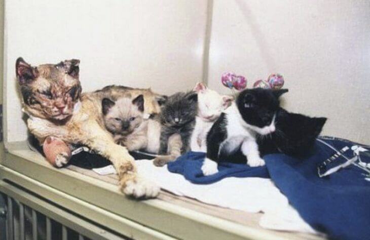 Essa corajosa gata vivia com seus filhotes de 5 meses de idade em uma garagem, que uma noite acabou incendiada por pessoas ainda desconhecidas. Com todo o amor do mundo, essa felina feroz fez questão de salvar sozinha todos os seus bebês.