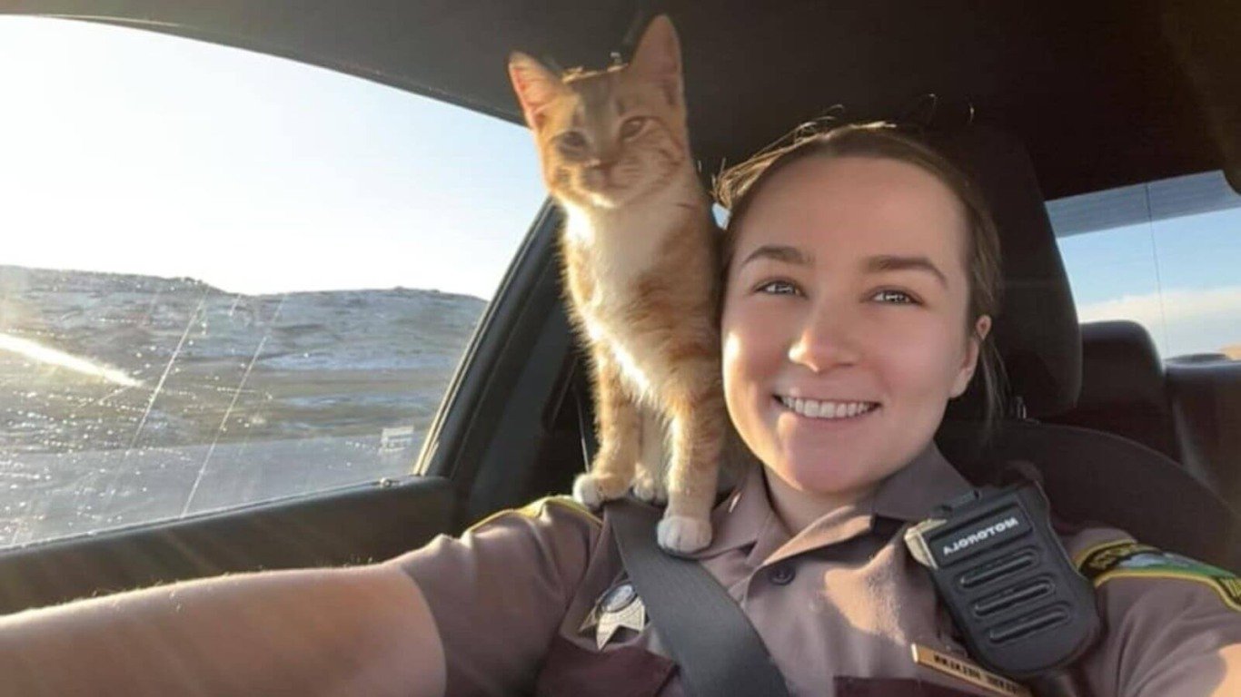 O gato não pertencia ao motorista que a policial havia parado – embora ele parecesse ansioso por carinho. Enquanto a policial concluía seu trabalho, o gato subiu em seus ombros, quase derrubando seu chapéu com seus aconchegos vigorosos. Depois disso, Elyse deu uma carona ao felino até um lugar seguro.