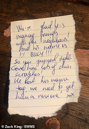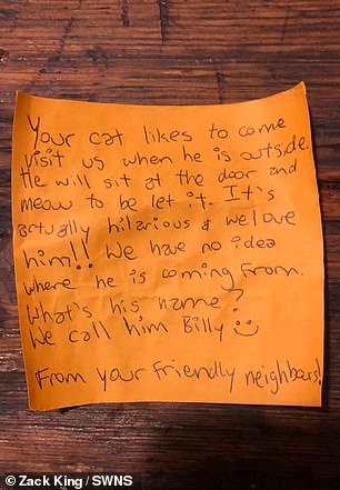 Na nota, o vizinho do casal escreveu: “Seu gato gosta de nos visitar quando está do lado de fora. Ele mia na porta para deixarmos entrar. Na verdade é engraçado e nós o amamos. Nós não temos ideia de onde ele vem. Qual o nome dele? Nós o chamamos de Billy.”