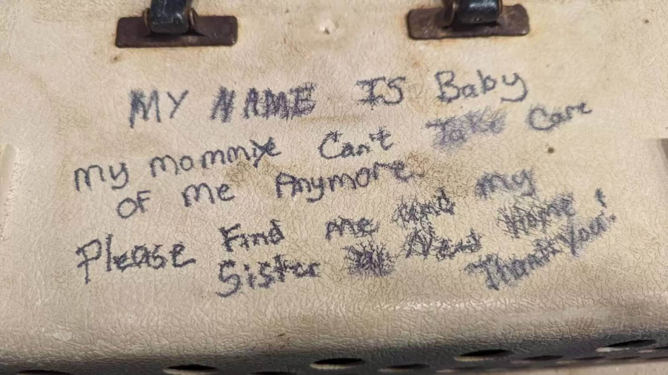 “Meu nome é Baby. Minha mamãe não pode mais cuidar de mim. Por favor, encontre um novo lar para mim e minha irmã. Obrigada!”
