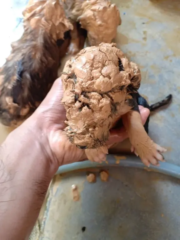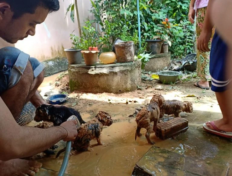Sem qualquer hesitação, Surachet removeu a grade do poço e se abaixou para dentro. Ele pegou cuidadosamente cada um dos cães enlameados e os colocou em solo seco. Os cachorros estavam cobertos da cabeça aos pés com uma pasta grossa e suja, e sua mãe não estava em lugar nenhum. Felizmente, eles foram descobertos a tempo.