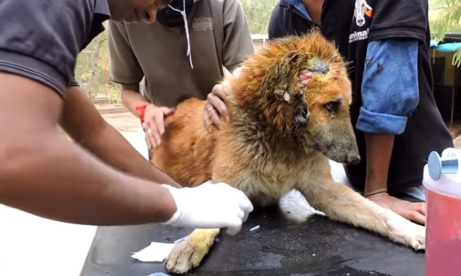 O cão parecia não ter mais forças para suportar o quão injusto o mundo tinha sido com ele, então ele se deitou no chão para esperar que tudo acabasse. Lá ele passou vários dias sem que ninguém o ajudasse, até que um vizinho teve pena e voluntários vieram em seu socorro.