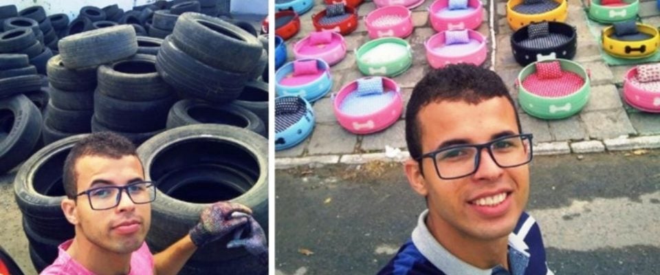 Graças a Amarildo Silva Filho, muitos desses animaizinhos tem uma chance de viver melhor apesar das condições. Ele, aos 23 anos decidiu reciclar pneus velhos para criar caminhas para cachorros de rua.