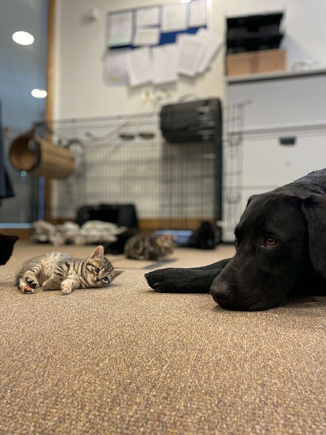 A tutora de Bertie, um labrador resgatado e adotado, teve uma linda surpresa quando viu que seu pet voluntariamente acolheu gatinhos filhotes que foram encontrados sem a mãe, à beira de uma estrada no Reino Unido, com cerca de duas semanas de vida.