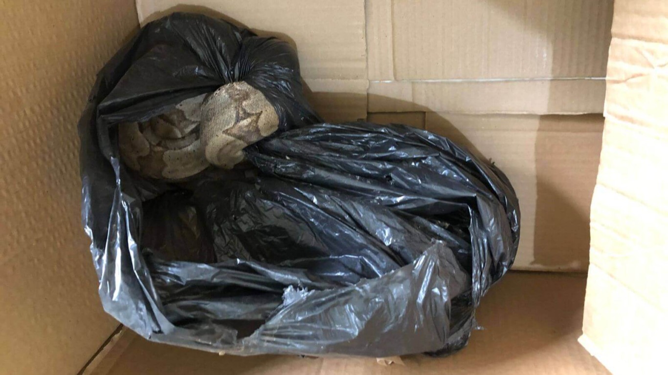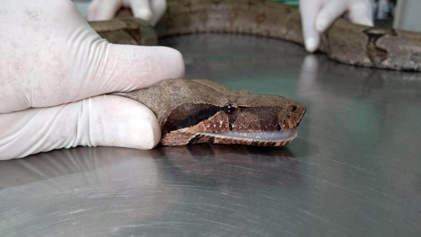 A Mata Ciliar recebeu um jiboia encontrada em uma fábrica de papel em Jundiaí. O animal estava dentro de um saco plástico, amarrado e dentro de uma caixa de papelão.