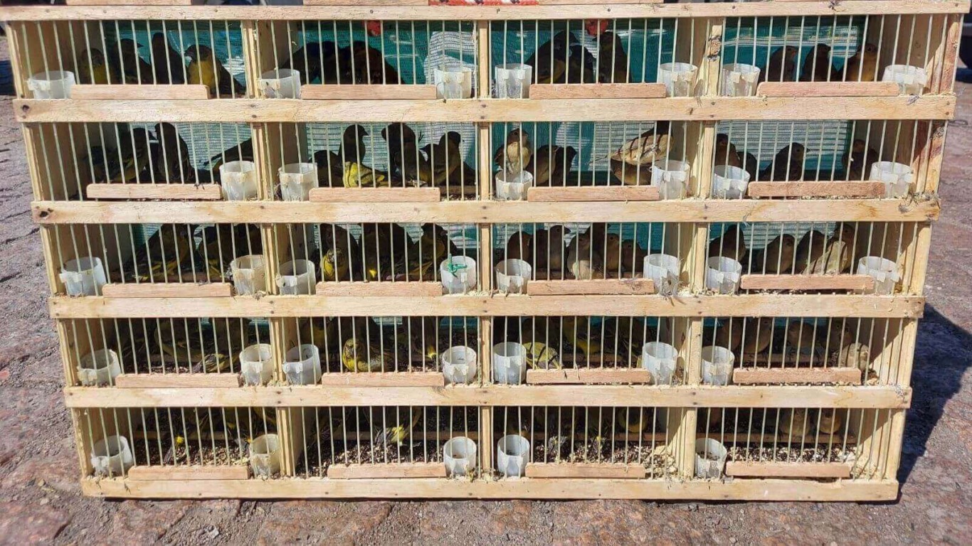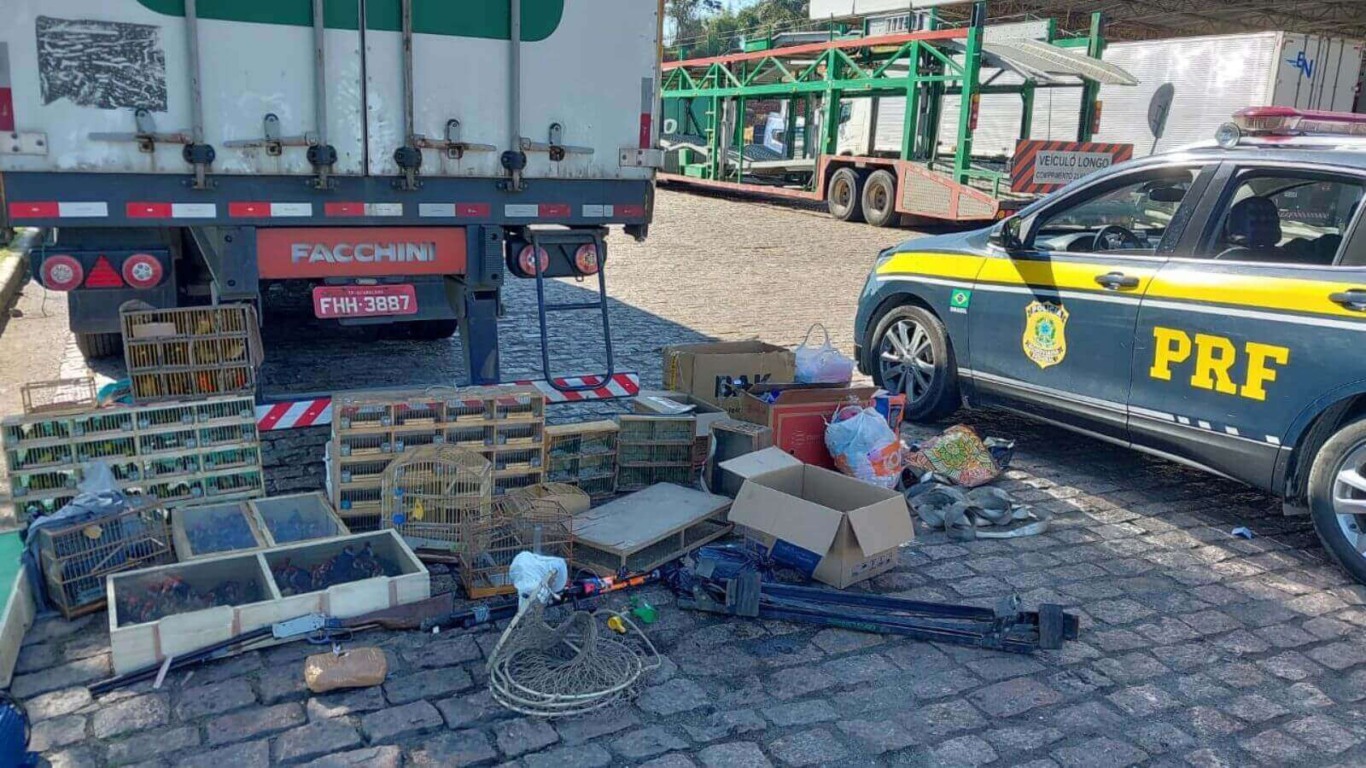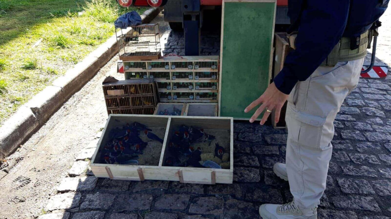 Assim, a polícia deteve o motorista e mais dois acompanhantes, em seguida encaminhados para o DP do município. Em um balanço inicial, há 85 pintassilgos, 67 cardeais-de-topete-vermelho, 35 coleirinhas, 5 sabiás, 3 tiês-sangue, 2 trinca-ferros, 2 pássaros-pretos, 1 coleirinha-manso entre os animais apreendidos. Além das aves, também havia um jabuti na carga do caminhão.