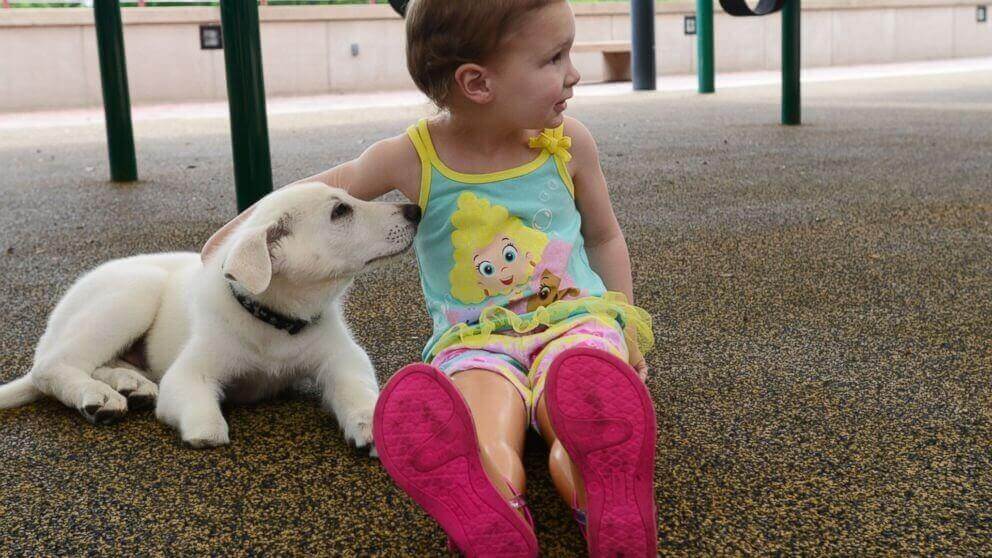 “Há duas semanas ouvimos sobre um tutor que contatou o hospital sobre um filhote que não tinha uma das patas. Ele queria que o cachorro crescesse com uma criança em circunstâncias semelhantes”, conta Ashley Johnson, mãe da menina.