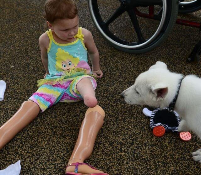 “Há duas semanas ouvimos sobre um tutor que contatou o hospital sobre um filhote que não tinha uma das patas. Ele queria que o cachorro crescesse com uma criança em circunstâncias semelhantes”, conta Ashley Johnson, mãe da menina.