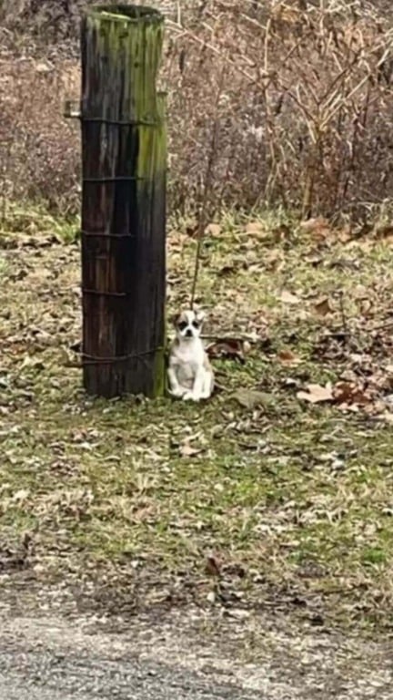 Um motorista que passava por uma estrada movimentada parou na hora quando avistou um cachorro amarrado a uma árvore quebrada. O cãozinho parecia aguardar pacientemente perto da calçada alguém lhe notar. Imediatamente, o motorista entrou em contato com um abrigo de animais local, e uma equipe de resgate correu para buscar o cão.