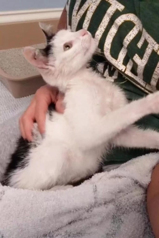 “Ele me informou que [o gatinho] havia sido jogado no estacionamento do Walmart e continuou entrando sorrateiramente na loja e se escondendo debaixo das palhetas”, disse Rahe ao portal The Dodo. “Eu não sei exatamente quanto tempo ele ficou lá, mas o funcionário me disse que outras pessoas já haviam tentado fazer o gato sair”.