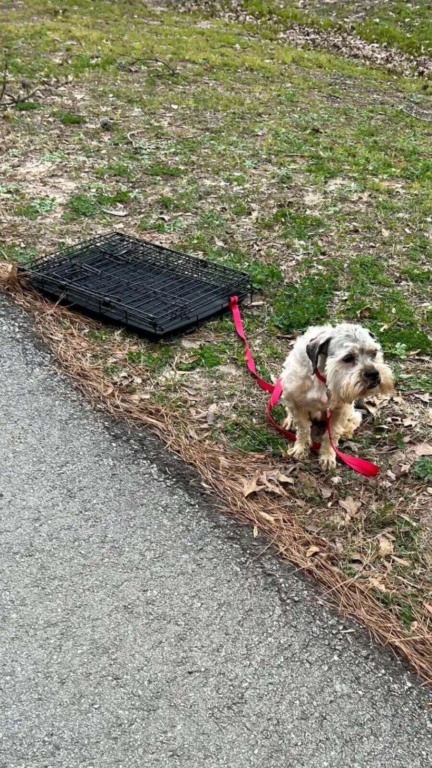 Tiffany Maki saia do parque depois de um passeio rápido com seus cães quando notou um pequeno e fofo pet sentado na grama, sozinho. O cachorro estava amarrado a uma caixa desmoronada e latia para as pessoas que passavam.