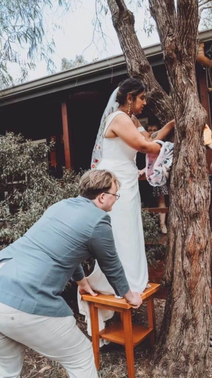 Logo após a cerimônia, um convidado contou a PJ sobre um gambá que se debatia em uma árvore próxima. Ainda vestida com seu vestido de noiva branco, a amante dos animais não hesitou em sujar as mãos.