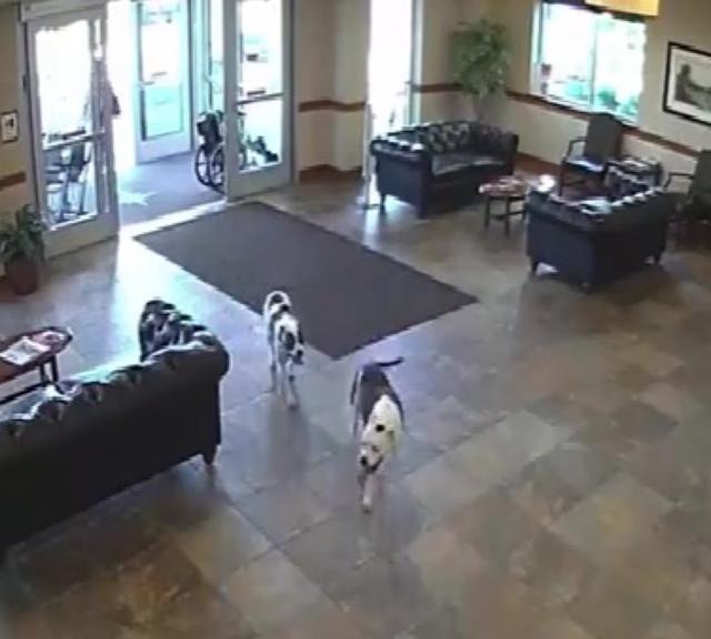 Nas filmagens de vigilância, os dois cães são vistos passeando casualmente nos corredores do hospital, surpreendendo uma das pessoas que lá se encontravam, antes de chegarem à farmácia, onde conseguiram chamar a atenção do farmacêutico atrás do balcão, que não pôde deixar de se perguntar o que estava acontecendo.