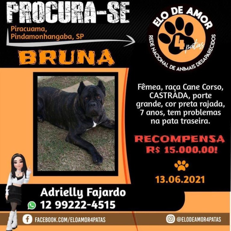 Essa medida mobilizou ainda mais a população de Pindamonhangaba, onde o caso aconteceu. Bruna desapareceu no dia 13 de junho, de dentro da chácara onde morava. Desde então, a tutora Adrielly, seu ex-marido, familiares e amigos se uniram para sair em busca da pet.