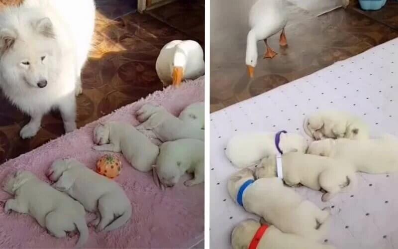 A gansa é muito amiga da cachorra e, quando ela deu à luz, a ave ajudou a cuidar dos filhotes. Gansos são tidos como animais territorialistas e “bravos”. Mas esta mãe gansa é tão gentil que até se tornou babá de cachorrinhos para ajudar cachorra no pós parto.