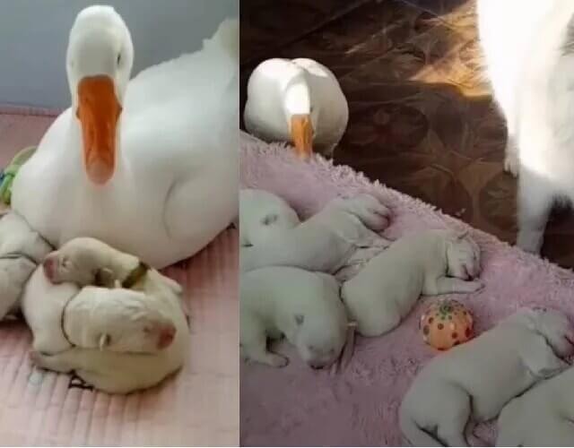 A gansa é muito amiga da cachorra e, quando ela deu à luz, a ave ajudou a cuidar dos filhotes. Gansos são tidos como animais territorialistas e “bravos”. Mas esta mãe gansa é tão gentil que até se tornou babá de cachorrinhos para ajudar cachorra no pós parto.