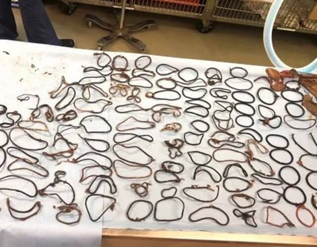 O cachorro Charlie, de 2 anos, passou mal após comer 117 elásticos de cabelo, a orelha de um urso de pelúcia e partes de roupas íntimas de seus tutores.