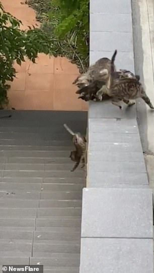 O gato mais velho agarra o gatinho em sua boca e tenta fazer o salto, mas o felino pequeno escorrega nos degraus. Ainda assim, o gato se recusa a deixar o filhote para trás, voltando para dar o salto e levá-lo para um lugar seguro.