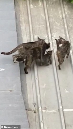 Três gatos adultos se recusaram a deixar um gatinho preso sozinho, e o ajudaram a saltar até um telhado para que ele pudesse se juntar ao grupo. Os gatos espreitaram pela borda do prédio em Nápoles, Itália, enquanto o filhote, que era muito pequeno para saltar sozinho, ficou preso nos degraus abaixo.