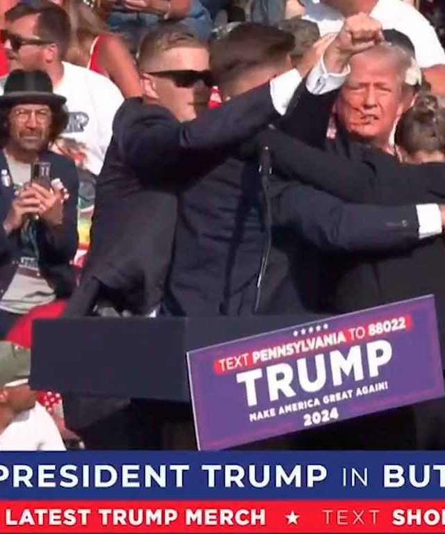 Enquanto era escoltado para um veículo pelos agentes do Serviço Secreto, Trump acenou para a multidão e ergueu o punho.