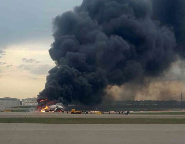 Um avião de passageiros Sukhoi Superjet-100 da companhia russa Aeroflot pegou fogo durante um pouso de emergência no Aeroporto Sheremetyevo, em Moscou, neste domingo (05).