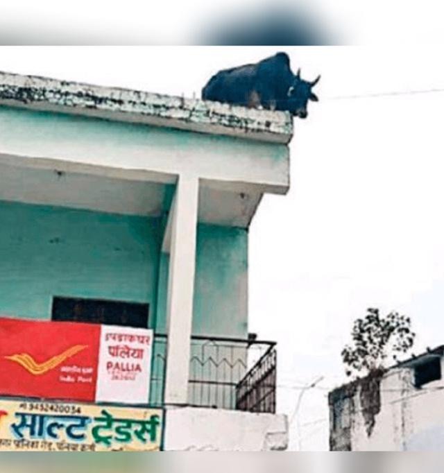 Um boi de meia tonelada subiu no telhado de um prédio comercial na Índia e precisou ser resgatado pelos policiais locais.