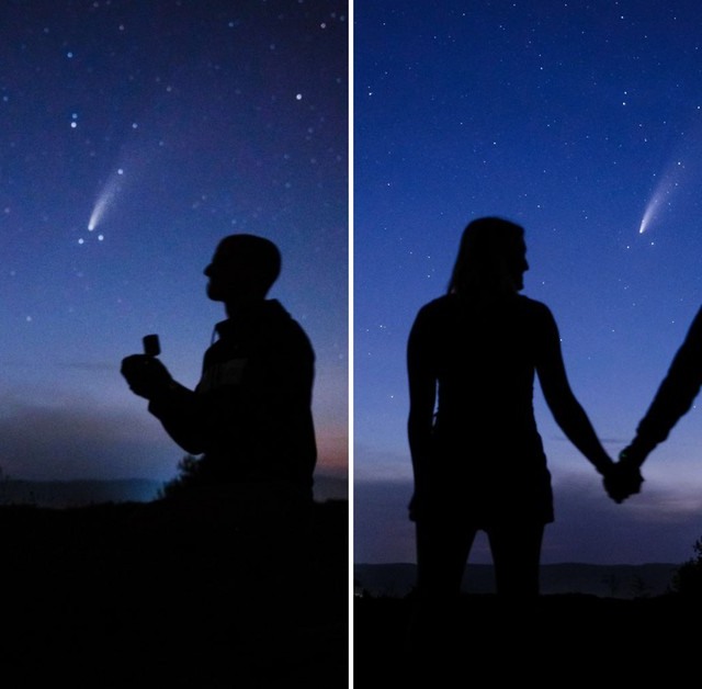 Um casal dos Estados Unidos aproveitou a passagem do cometa Neowise pele hemisfério norte e realizou fotos incríveis do momento do noivado que viralizaram pelo mundo. A postagem foi retuiada até pela Estação Espacial Internacional (ISS) e pelo astronauta Garrett Reisman, que desejou felicidades ao casal.
