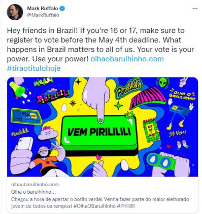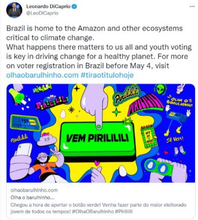 “O Brasil abriga a Amazônia e outros ecossistemas críticos para as mudanças climáticas. O que acontece lá é importante para todos nós e o voto dos jovens é fundamental para impulsionar a mudança para um planeta saudável. Para saber mais sobre o registro de eleitores no Brasil antes de 4 de maio, visite http://olhaobarulhinho.com #tiraotitulohoje” publicou DiCaprio.