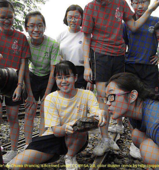 A imagem em questão, se trata de um grupo de meninas posando com uma pequena tartaruga, porém enquanto o cérebro nos faz pensar que ela é colorida, na realidade ela está em preto e branco.