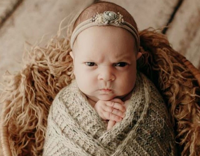Uma bebê de 14 dias de vida viralizou na web após fazer um ensaio newborn bem diferente. Ela fez cara de brava nas maiorias das fotos, mas mesmo assim continuou fofa.