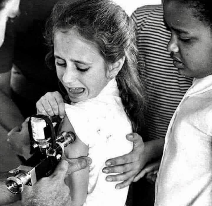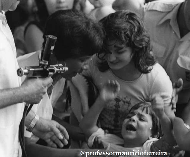 Me lembro que na escola formávamos longas filas, todos chorosos e apavorados, obviamente. Um após o outro, quase que sem parar de andar, éramos imunizados com uma pistola – o famoso “revolvinho” – que nos remetia à vacinação praticada no gado.