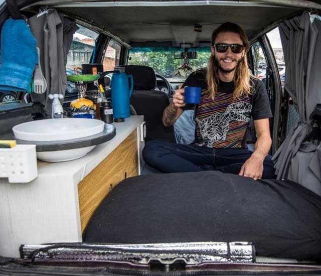 “Tiramos os bancos traseiros e no lugar montamos uma chapa de madeira dobrável e um armário com pia”, explica o viajante.