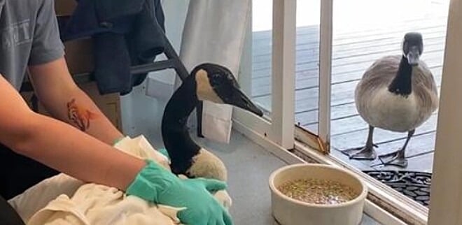 Uma ganso fêmea conseguiu encontrar o local onde seu companheiro estava internado, machucado, e batia na porta, apreensiva, para poder revê-lo. O Cape Wildlife Center publicou o caso nas redes sociais, e o casal ganhou o coração dos internautas.