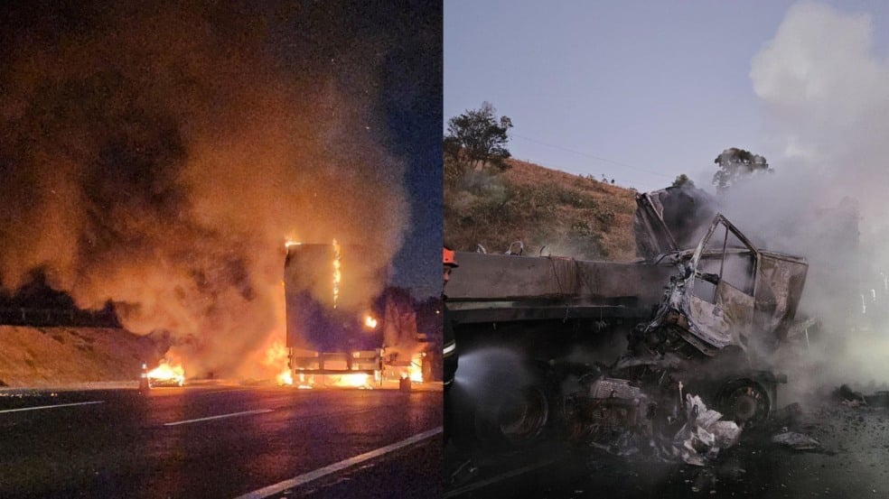 O acidente ocorreu quando um caminhão colidiu na traseira da carreta que transportava as vigas de concreto. Logo após o impacto, o caminhão pegou fogo, mas o motorista conseguiu sair a tempo. Ele saiu ileso, consciente e orientado. O incêndio foi controlado pelos bombeiros, e o local foi deixado em segurança após o atendimento.