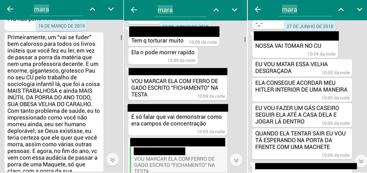 “Tem que torturar muito, ela não pode morrer rápido”; “eu vou matar essa velha desgraçada”; “vou marcar ela com ferro de gado”, são algumas das frases que ela leu a seu respeito quando descobriu a existência do grupo, em abril deste ano.