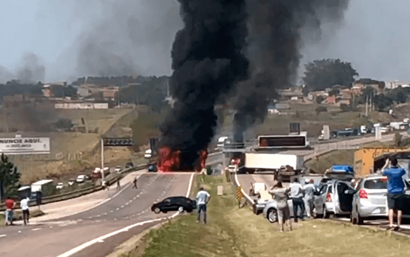 Para interditar a rodovia, três caminhões foram incendiados. A fumaça foi vista de longe, assim como a movimentação de viaturas da polícia.