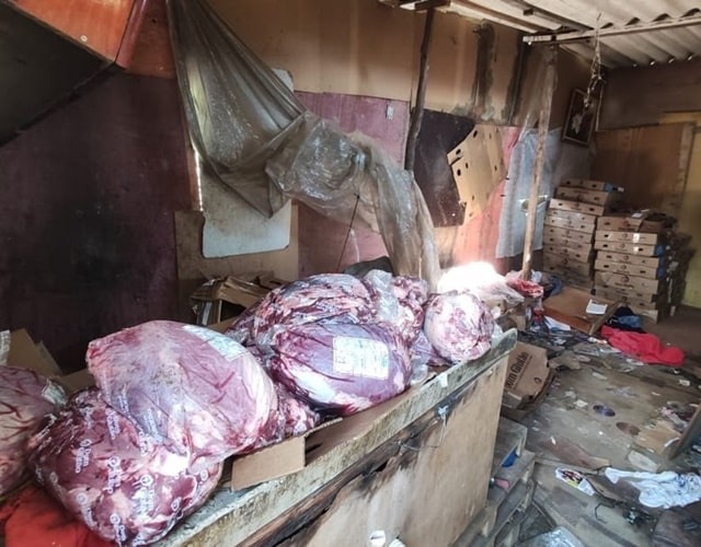 Os policiais realizaram vistorias na região e em um barracão encontraram várias caixas com as peças de carne. O local fica em uma área de mata e não tinha resfriamento para conservar o produto.