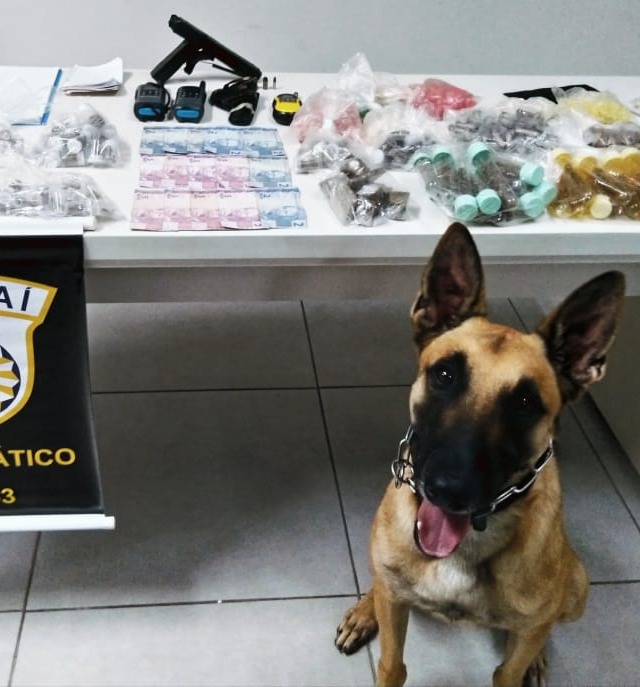 O cão Logan, do Canil da Guarda Municipal de Jundiaí (GMJ), desbaratou na noite de sábado (13) um ponto para depósito de drogas e arma de fogo, em dois apartamentos localizados na Vila Esperança. Nos imóveis, as equipes do Canil e do Apoio Tático apreenderam maconha, crack, cocaína e haxixe, além de uma pistola de fabricação caseira. Dois homens foram presos em flagrante por tráfico de entorpecentes e posse de arma de fogo.