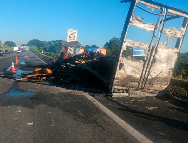 Segundo a Polícia Rodoviária, o fogo teria começado na roda traseira da carreta e se alastrado por todo o veículo.