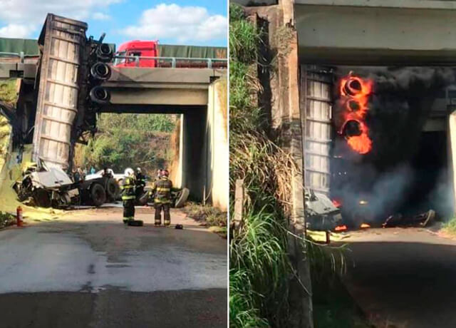 Um caminhão e um carro caíram de um viaduto localizado próximo ao km 82 da Rodovia dos Bandeirantes, trecho Campinas, na tarde desta quinta-feira (18). O caminhão chegou a pegar fogo quando atingiu o solo.